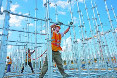 长白山动车库是吉林省第一条旅游客专敦白高速铁路唯一承担动车保养维护任务的“4S店”。为了把疫情耽误的进度抢回来,紧抓东北3个月黄金施工期,中铁建电气化局敦白客专项目部强化现场施工组织,加班加点,确保工程按期交付。图为8月25日,工人们顶着烈日,在敦白客专长白山动车库组搭脚手架。 曹筱璐 摄