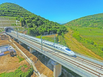 日前,由中铁十一局、中铁二十一局等单位参建的银西高铁甘宁段与陕西段顺利接轨,标志着银西高铁全线轨通。银西高铁全长618公里,设计时速350公里,全线共设车站20座,建设者在工艺工法上积极创新,攻克了黄土特长隧道施工等技术难题。图为日前,首趟动检列车驶出银西高铁小章隧道。 杨丙峰 摄