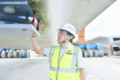 图为袁川贵在检查箱梁支座安装质量。段文婷 摄 |