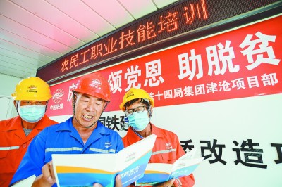 10月27日,中铁十四局二公司津沧项目部开展农民工职业技能培训,由技术骨干讲授施工技术和安全知识,手把手教他们提升专业技能。自进场以来,该项目部针对贫困劳务工人,通过“给岗位、提素质”,实行“造血式扶贫”,成功助力他们脱贫致富。图为农民工进行消防安全知识学习。