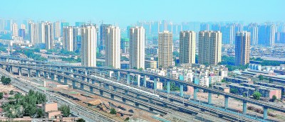 图为动车经过中铁二十一局承建的兰新高铁引入兰州铁路枢纽桥群工程。周 鹏 摄 |