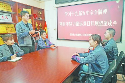 连日来,中铁十六局二公司本部以及所属各项目部通过集中学习、主题党课、座谈研讨等方式迅速掀起党的十九届五中全会精神学习热潮。图为11月11日,该公司计试中心党支部组织召开“学习十九届五中全会精神,项目年轻力量远景目标展望”座谈会。 张 超 摄