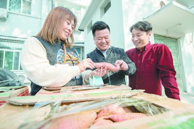 日前,在中铁十四局总部,两车500多箱红薯不一会儿就被职工们领完。据悉,最近几年,中铁十四局主动联系沂蒙山区老乡,团购新鲜红薯,直接从地头到职工的食堂,为当地农产品开启了新的销路,增加了农民收入。图为职工们在领红薯。范成涛 摄