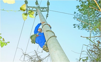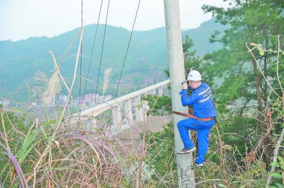 长达60余公里的电力线路绵延在深山中,巡线员们沿线进行巡视,时不时爬到电线杆上,对电力设备进行检测维修。图为上午10点40分,张学年踩着脚扣上电线杆仔细查看。 |