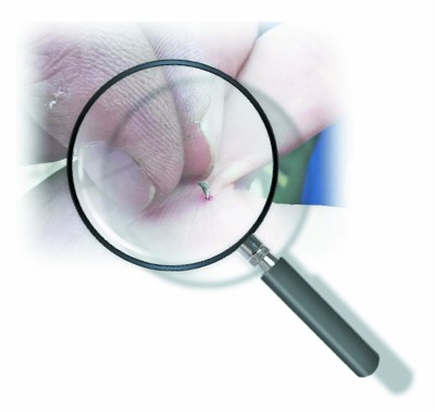巡线过程中,有时也会遇到危险,特别是遭遇眼镜蛇和山上的野蜂。图为下午6点20分,董军清理扎在手上的倒刺。 |