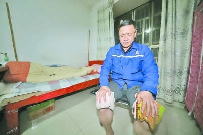 在睡觉前,巡线员们每天都要烫脚驱寒,以减少湿冷天气对身体的侵害。图为晚上8点50分,张学年用热毛巾对膝盖热敷。 |