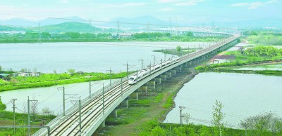 中铁十七局承建的安九高铁,地处安徽省安庆市境内,紧邻长江干线十大港口之一的安庆港,位于多条流入长江流域的水源施工,主要包括龙山隧道等3座隧道、石门湖特大桥等18座桥梁,总长38公里。图为4月8日,高铁通过石门湖特大桥。 |