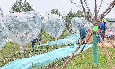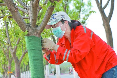 ②受疫情和雨季的影响,苗木的栽植时间不断被压缩,在冬季寒流的影响下,苗木存活率也面临极大挑战。为解决这一难题,在雨季和寒流之前,抢先完成全线苗木的栽植,并进行了杀虫、涂白、带帽、盖被等一系列防护措施,有效保障了苗木成活。图为施工人员正在进行苗木冬季防护。