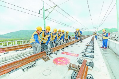 近日,中铁十一局建设者驾驶无砟轨道铺轨机组,将一对500米长钢轨铺设到无砟轨道承轨槽内,安(庆)九(江)高铁湖北段与安徽段在两省界顺利完成接轨。安九高铁正线全长198.3公里,是国家中长期铁路网规划“八纵八横”高速铁路主要通道京港(台)通道的重要组成部分,设计时速350公里。刘连强 摄