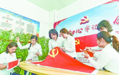 “把对党的热爱化在针里,把要报的党恩融入线中,迎接中国共产党百年华诞。”连日来,中铁二十局财务共享服务中心的6名女职工在工作之余一针一线地认真绣起一面面鲜红的党旗。穿针走线间,大家交流党史学习教育心得体会,不断增强荣誉感、使命感和责任感。图为女职工正在党员活动室接力刺绣党旗。赵渊青 摄