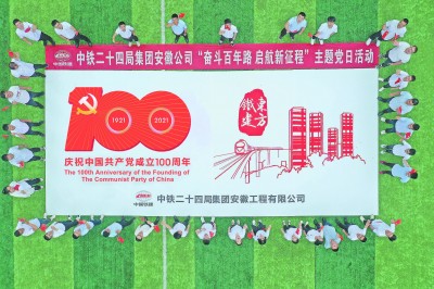 ▼为庆祝中国共产党成立100周年,中铁二十四局安徽公司党委组织开展“奋斗百年路 启航新征程”主题党日活动。30余名党员在公司足球场共绘百年“红”图,表达爱党爱国的心声以及对党的百年华诞的深深祝福。图为绘制完成的红色画卷。江 涛 摄