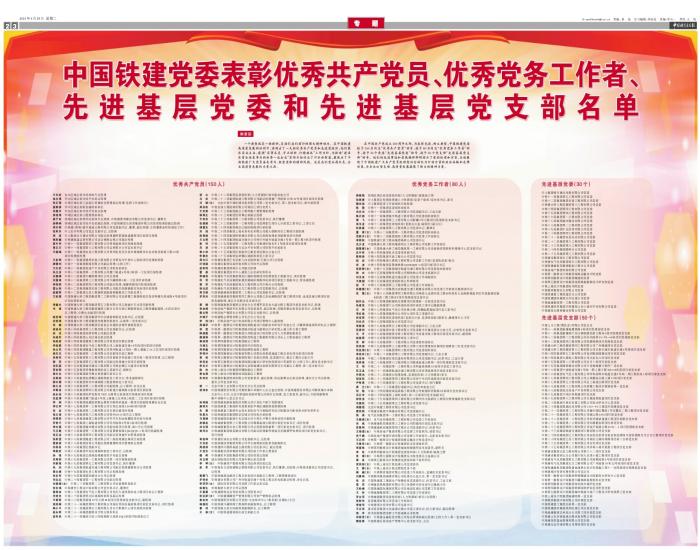 在中国共产党成立100周年之际,为表彰先进、树立典型,中国铁建党委授予150名同志“优秀共产党员”称号,授予80名同志“优秀党务工作者”称号,授予30个党委“先进基层党委”称号,授予50个党支部“先进基层党支部”称号。他们的先进事迹和崇高精神鲜明昭示了党的性质和宗旨,生动展现了中国铁建广大共产党员把理想信念转化为行动力量的政治品格和先锋形象,为企业攻坚克难、高质量发展凝聚了强大的精神力量。