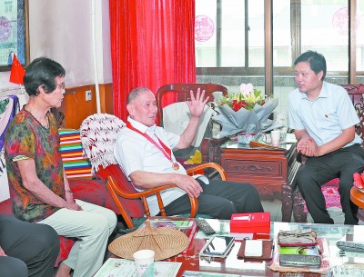 在建党100周年之际,中铁十二局党委走访慰问受到党内功勋荣誉表彰的老党员,并为其佩戴“光荣在党50年”纪念章。图为日前,慰问人员聆听82岁老党员何海涛回忆铁道兵时期的光荣岁月和企业搏击市场的难忘时光。赵桂军 摄