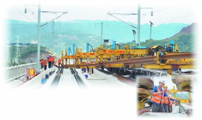 图为施工人员引导钢轨穿过本邻两线铺轨设备。庞 军 摄