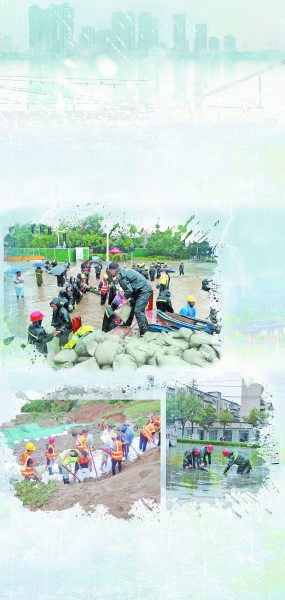 ①受河南突发强降水天气影响,7月20日,中铁十一局城轨公司郑州12号线项目部迅速开展自救和抢险工作。图为项目人员堆码沙袋防止雨水倒灌地势低洼处。李玉青 摄