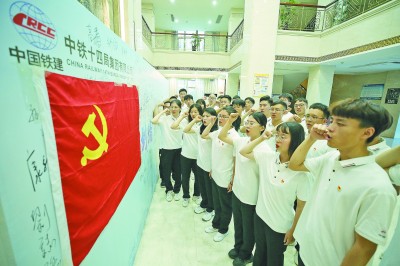 ▲日前,在新员工报到的第一天,中铁十四局党委组织新员工党员重温入党誓词,增强他们爱党爱国爱企之心。刘 萍 摄