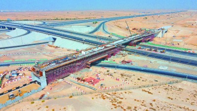 当地时间11月3日,中国土木顺利完成阿联酋铁路世博桥主体结构混凝土浇筑,成功架起当地新地标性建筑。世博桥为双线现浇预应力箱梁结构,全长251.45米,共6跨,单跨最大跨度55米。该桥横跨世博高速,且周围通信电缆、埋地高压线、天然气管道等13处公共设施需迁改保护,受到迪拜政府有关部门重点关注。该桥主体工程完工对年底正线铺轨贯通具有重要意义。图为世博桥主体结构混凝土浇筑现场。谢 锋 摄