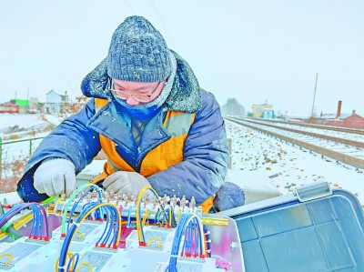 ▲11月7日至8日,受强冷空气影响,黑龙江东北部地区出现暴雪降温极端天气。中铁二十三局电务公司绥佳线香兰站大修改造工程项目部组建多支清雪突击队清除冰雪,并做好对现场设备的维护。图为现场作业人员在风雪中整理箱盒配线。王 鹏 摄