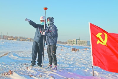 ▶11月8日,玉门市气温骤降,达零下20摄氏度。中铁二十一局二公司玉门经济开发区“一区三园”项目技术人员,顶风冒雪进行现场测量,为年底前完成既定建设目标提供有效数据。图为技术人员正在现场测量。