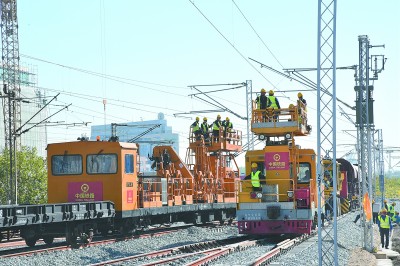 图为中铁建电气化局建设者在匈塞项目新贝尔格莱德站使用接触网轨道车进行施工作业。 郭 栋 摄 |