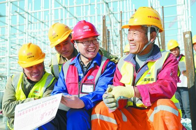 ◀连日来,中铁十四局四公司本部及所属项目通过主题党日、主题党课、集中学习、座谈研讨等方式迅速掀起党的十九届六中全会精神学习热潮。图为该公司沂南冷链项目员工在施工现场热议党的十九届六中全会精神。杜昱葆 摄 |