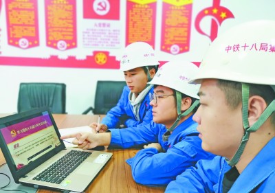 ▶ 党的十九届六中全会召开后,中铁十八局北京公司长沙项目党支部通过线上+线下的学习形式,将集中学习与个人自学相结合,营造多形式宣贯的学习氛围。图为项目部党员干部研讨全会公报。廖彬羽 摄