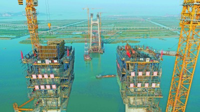 12月4日,由中铁十八局承建的广州南沙红莲大桥主塔顺利封顶,标志着大桥全面进入主桥钢箱梁安装阶段,为2022年建成通车创造了有利条件。该桥主桥长912米,采用双塔双索面混合梁斜拉桥型,塔高180米,飞跨珠江水系龙穴南水道的主桥跨度达580米,是目前我国同类型多功能斜拉桥的最大跨度。图为红莲大桥主塔封顶。 丁 迪 摄