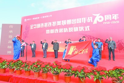 2020年10月18日,中铁十一局一公司在广西南宁南(宁)玉(林)铁路施工现场举行“纪念杨连第连抗美援朝出国作战70周年暨杨连第队授旗仪式”。 杨龙凤 摄 |