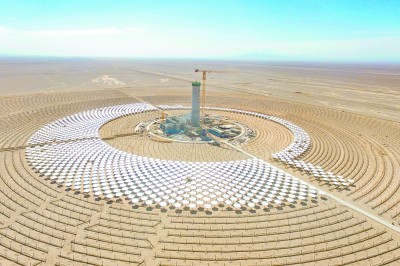 8月27日,由中铁十一局承建的阿克塞汇东新能源光热+光伏试点项目厂前区主体结构顺利封顶。该项目位于甘肃省酒泉市,最高海拔3600米,总建设用地面积约16平方公里。项目建成后,可实现年均上网电量17亿千瓦时,对加快构建当地新能源增长极、谱写中国式现代化甘肃实践新篇章具有积极意义。图为建设中的光热动力岛区及镜场区。杨欣欣 摄