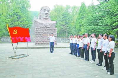 在第二批主题教育启动之际,日前,中铁十七局物资公司党委组织党员干部前往山西省昔阳县大寨村开展“学思想、强党性、重实践、建新功”主题党日活动。大家沿着石头路,爬坡而上,追寻老一辈大寨人将深沟变良田,创造农业奇迹的实干印记,以实地研学为主题教育开好头起好步。图为该公司党员干部职工在虎头山下重温入党誓词。邵 南 摄