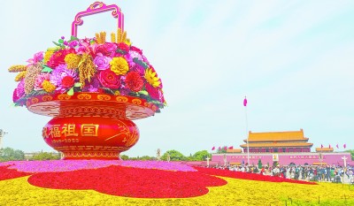 9月28日,天安门广场上“祝福祖国”巨型花篮吸引大批游客。篮内喜庆丰收的五谷和美好寓意的花卉,体现了花团锦簇、五谷丰登。图为“祝福祖国”大花篮。 王炳尧 摄