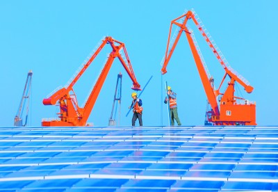11月17日,由中铁十四局电气化公司建设的江苏镇江大港光伏工程顺利并网发电。该工程占地2.3万平方米,装有光伏组件6708块,每年可产生清洁电能362万千瓦时,不仅能满足港口自用电,还能将剩余电量并入公共电网,实现电能“自发自用,余电上网”,产生良好社会经济效益。图为光伏发电并网施工现场。范成涛 摄