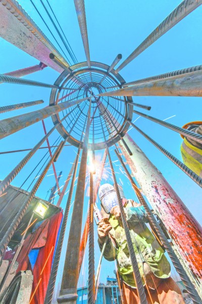 2023年12月29日,在中铁十四局济泺路穿黄北延隧道施工现场,建设者正全力推进“黄河号”盾构机强力克服局部夹杂钙质结核等特殊地质,平稳高效掘进至对岸加固区,向隧道贯通目标发起冲刺。图为工人正在焊接钻孔灌注桩钢筋笼。范成涛 摄