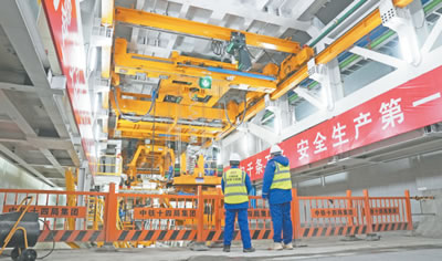 1月4日,在中铁十四局京唐城际铁路运潮减河隧道工程施工现场,开挖直径达13.3米的“京通号”国产超大直径泥水平衡盾构机正快速掘进。该盾构机是目前北京市最大直径铁路隧道盾构机,将用5个月时间掘进1285米,全力冲刺今年6月全线贯通目标。图为京唐城际铁路盾构机操作人员正在检查箱涵吊装设备。钟行利 摄