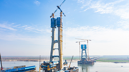 | 中铁十一局承建的世界最大主跨高速铁路无砟轨道混凝土梁斜拉桥—沪渝蓉高铁钟祥汉江特大桥。古建敖 摄 |