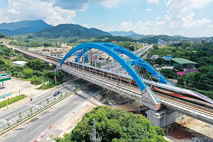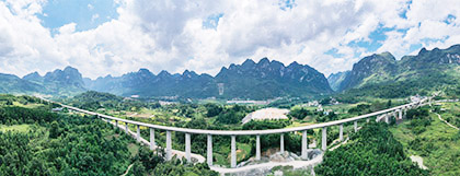 | 2023年8月31日,随着中铁十一局、中铁十二局、中铁十四局、中铁十八局、中铁二十一局、中铁建设等单位参建的贵南高铁南宁东至荔波段开通运营,标志着贵南高铁全线开通运营。图为贵南高铁捞村双线特大桥。 张 杰 摄 |