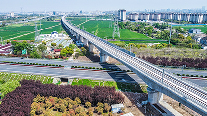 | 2023年9月28日,中铁十二局、中铁十六局、中铁二十二局、中铁二十四局、中铁建设、中铁建电气化局、铁五院、昆仑集团参建的沪宁沿江高铁全线开通运营。图为沪宁沿江高铁跨疏港高速公路特大桥。 刘贵铭 摄 |