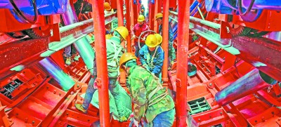 近日,在中铁十八局二公司亭子口灌区一期项目施工现场,工人正在中国铁建最大的一体化自行式造槽机内进行槽身混凝土浇筑。丁 迪 摄 |