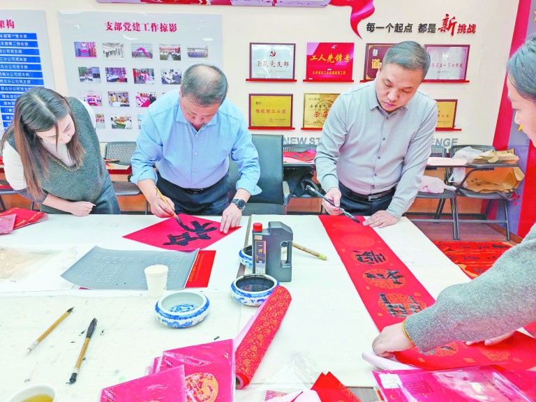 在新春佳节到来之际,中铁十七局物资公司邀请山西省书法家协会书法家走进企业,为基层职工写春联,送祝福。图为活动现场。侯 莉 摄