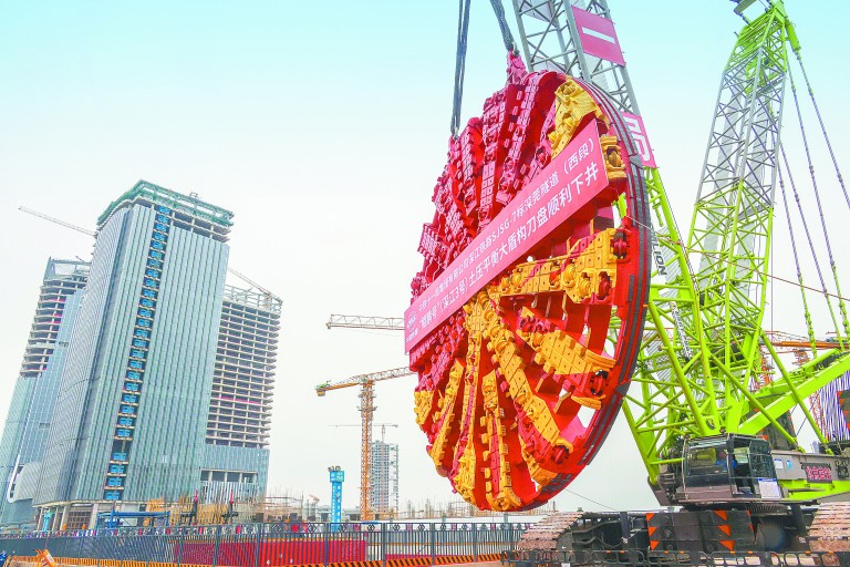 2月28日,在中铁十一局深江铁路全线控制性工程——深莞隧道(西段)施工现场,国内复合地层最大直径土压平衡盾构机“鲲鹏号”(深江3号)刀盘顺利吊装下井。深江铁路是我国“八纵八横”高铁网沿海通道的重要组成部分,也是重要的跨江城际通道,正线全长约116公里。图为“鲲鹏号”盾构机刀盘吊装现场。闵 辉 摄