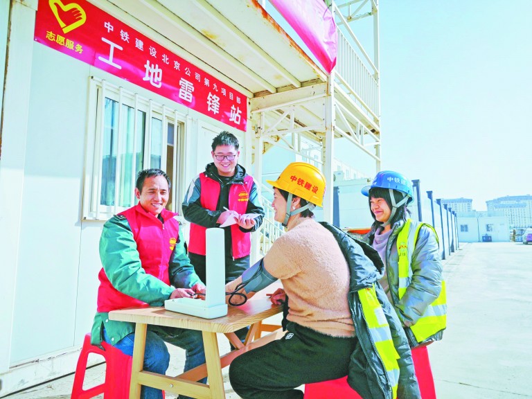 近日,中铁建设北京公司团委在雄安新区雄东B单元标段三项目现场设立工地雷锋站,开展以“传承雷锋精神,传递身边温暖”为主题的学雷锋志愿服务活动。其间,志愿者为劳务人员义务理发、宣讲维权、免费体检。图为志愿者组织工人测量血压。王宪卿 摄