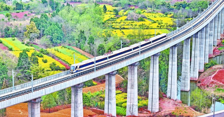三月十七日,西南地区首条跨市域轨道交通线路成都轨道交通资阳线完成带电首跑测试。该线路由中国铁建昆仑投资集团承建、中铁建电气化局参建,全长约三十九公里,连接天府国际机场和资阳市。线路沿途油菜花开春意浓,满目金黄沐春风。图为首趟电客车驶过油菜花田。蒋显正 摄