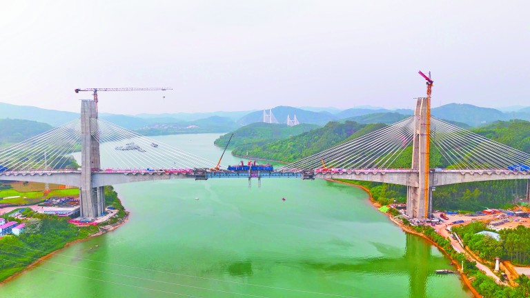 近日,由中铁十四局承建的南深高铁南玉段六律邕江特大桥主桥顺利合龙,标志着新建南宁至玉林铁路桥隧全线贯通。该桥主跨320米,是国内在建时速350公里无砟高铁最大跨径钢混矮塔斜拉桥。中铁十四局成立青年技术创新工作室,研制出国内承重最大、施工节段最长的悬臂灌注造桥机,承重能力突破千吨,最大施工节段可达8米。南深高铁南玉段建成通车后,南宁至玉林行程将由2小时缩短至50分钟左右。赵旭东 摄