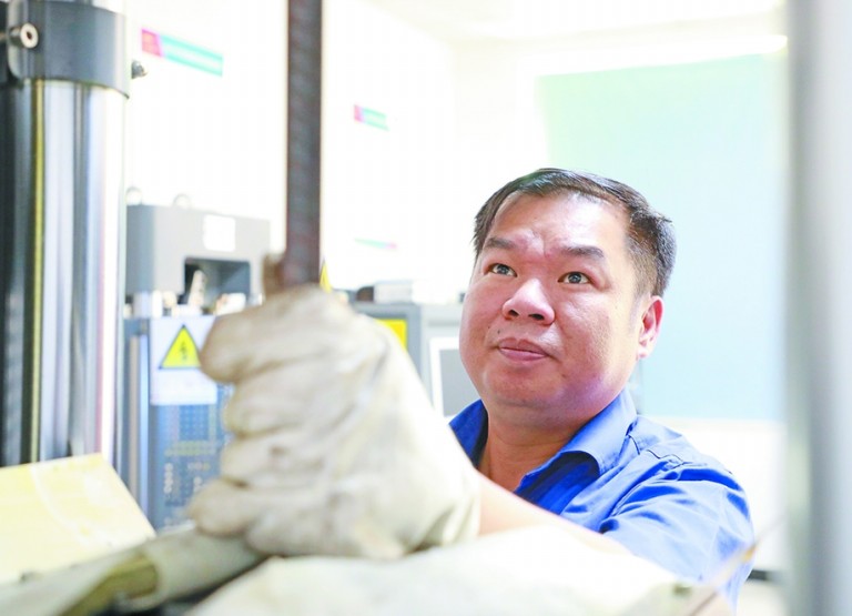 陈永胜在进行钢筋拉伸试验。 彭 特 摄 |