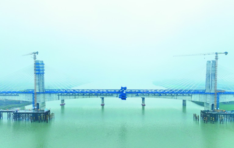 11月16日,上海院总体设计、中铁十二局施工的淮宿蚌城际铁路淮河特大桥主跨顺利合龙。该桥主跨248米,是目前淮河已建成跨度最大的铁路桥。淮宿蚌城际铁路正线全长约161公里,设计时速350公里,设车站6座,建成运营后将成为皖北城市群连接合肥都市圈及沪宁杭等地区的便捷通道,对于打造“轨道上的长三角”,完善区域城际快速铁路网布局,促进区域经济协调发展等具有重要意义。图为合龙后的淮河特大桥主跨。雷 昊 摄