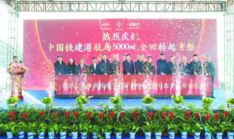 12月26日,中国铁建5000吨自航式全回转起重船“铁建起重5000”在江苏南通顺利交付。图为中国铁建党委书记、董事长戴和根与受邀嘉宾领导一道出席交付仪式。陈创海 摄 |
