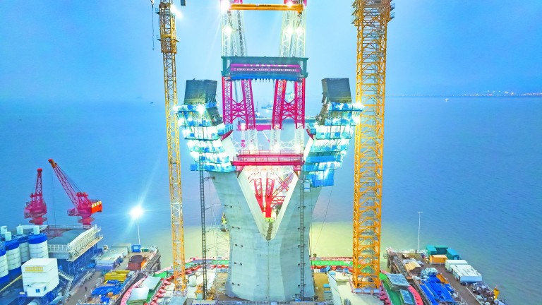 2月23日,随着“铁建大桥起1号”2500吨起重船吊臂缓缓下放,由中国铁建大桥局参与建设的宁波舟山港六横公路大桥二期工程青龙门大桥3号主塔下横梁型钢骨架部品吊装完成,百米塔肢成功“牵手”,大桥主体结构施工进入新阶段。孙镇霖 摄