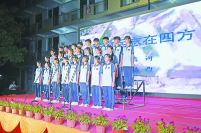 近日,中铁建设联合铁四院在乡村振兴定点帮扶的广西隆安县乔建镇初级中学开展“开学第一讲——走近大国工匠”主题活动。为了进一步做好文化振兴工作,中铁建设不仅为该校援建四方书院,组织员工捐赠各类书籍4300余册,还在今年7月邀请师生代表到北京开展研学活动。图为学生合唱《铁道兵志在四方》。