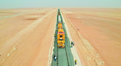 当地时间2025年7月7日,中国铁建承建的阿尔及利亚西部铁路矿业线项目135公里优先段轨道铺通,标志着非洲首条沙漠重载铁路建设取得重大进展。 李 子 摄 |