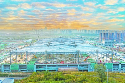 10月27日,由铁一院设计、中铁建设承建的我国西部在建最大高铁站西安东站站房主体结构顺利完工。西安东站站房屋盖采用全国首例山脊组合造型斜交空间管桁架结构,高低起伏、错落有致的菱形屋面,生动再现“八百里秦川”的壮阔气势。图为主体完工后的西安东站站房。曹国锋 摄